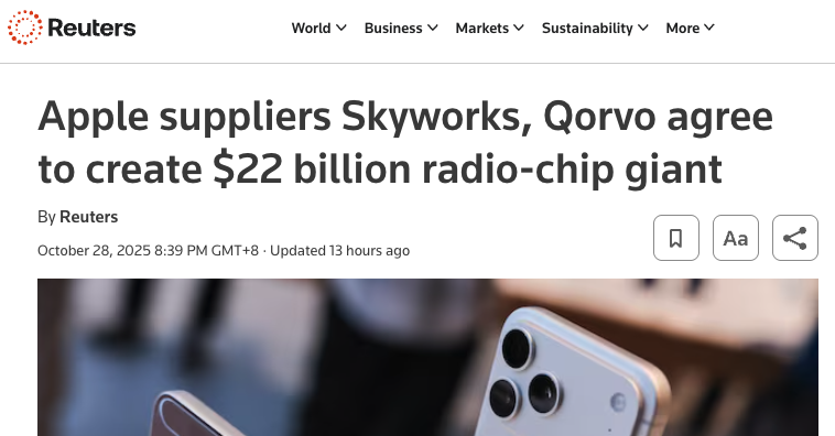 據悉,思佳訊與科沃均為蘋果核心射頻芯片供應商,但近年來面臨蘋果自研芯片的挑戰。2025年iPhone 16e機型已部分採用蘋果自研射頻模塊,導致兩家公司訂單承壓。外媒認為,合併後,新公司將整合濾波器、功率放大器等關鍵技術,提供更完整的系統級解決方案,增強與蘋果的議價能力。(青山)