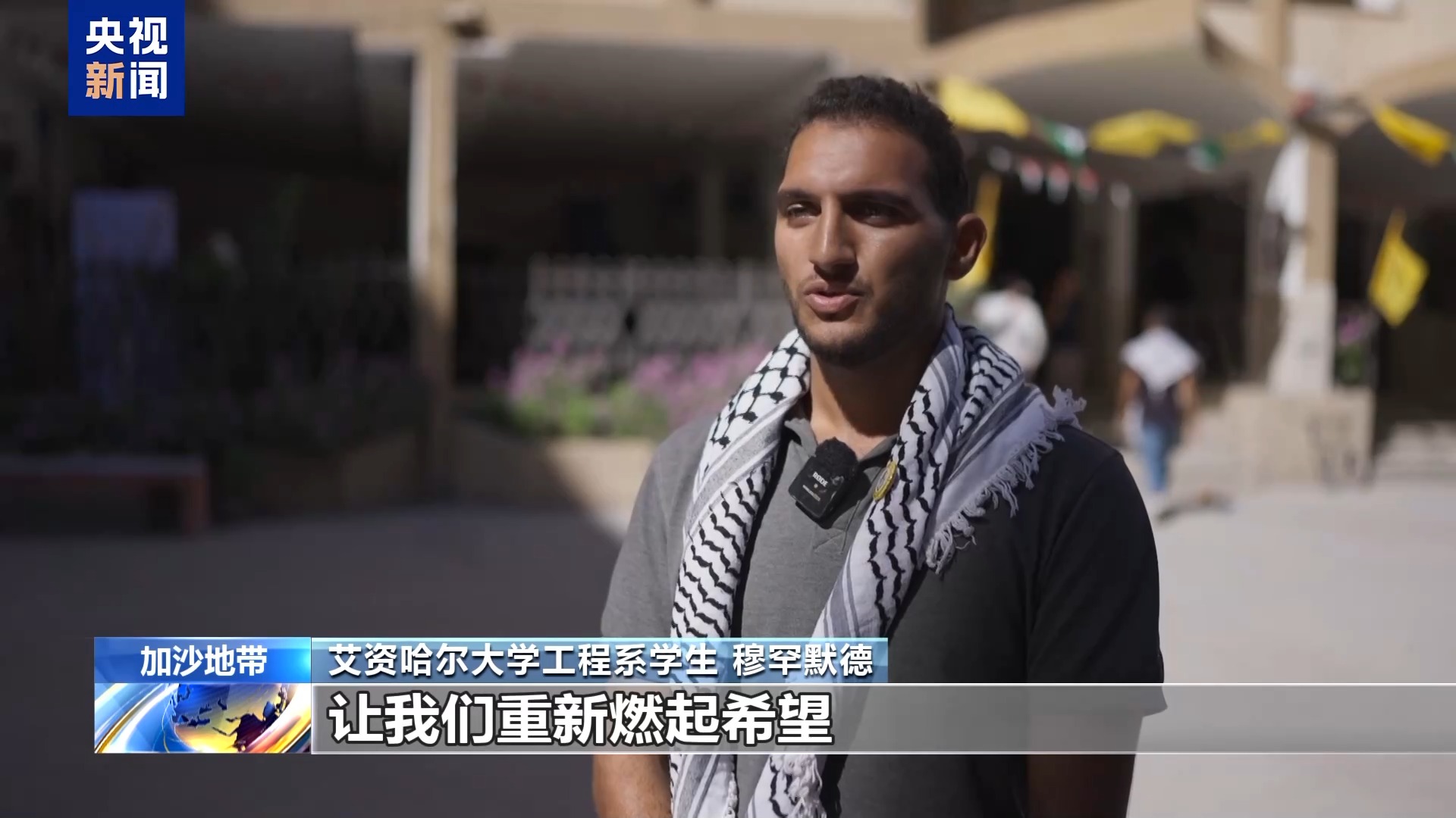 *總枱報道員 奧薩馬:*我現在所在的位置是加沙地帶的艾資哈爾大學。經歷了兩年的戰爭後,這裏首次重新向新生開放校門,為新學年做準備。雖然校園在以色列軍隊的轟炸中遭受嚴重破壞,教學物資依然短缺,而且由於大量居民流離失所,這裏一度被改作避難中心,但令人欣慰的是,人們仍然重視教育。