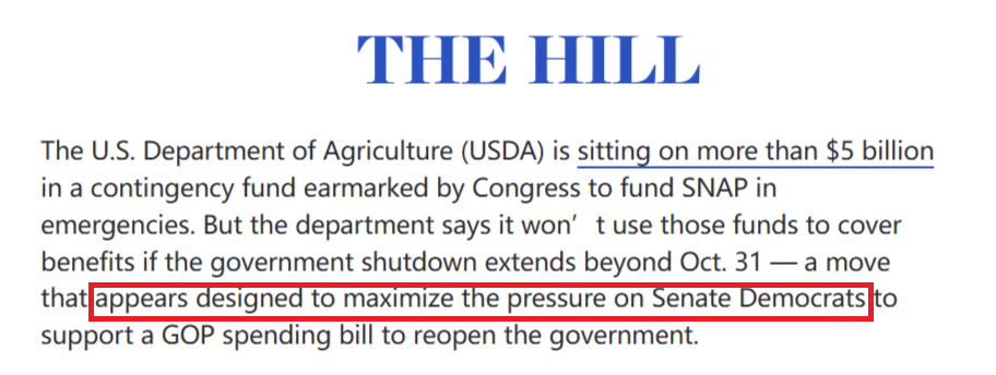 對此,美國《國會山報》直言,農業部種種説辭顯然為了最大限度地向參議院民主黨人施壓,迫使他們支持共和黨的支出法案,以重啓政府。