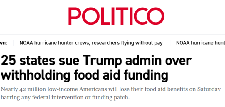 據美國《政治報》網站報道,受政府持續“停擺”影響,美農業部宣佈暫停其“補充營養援助計劃”(SNAP),11月1日起停止發放食品救濟。目前這一項目覆蓋約4200萬人,約佔美國總人口八分之一,其中多數為低收入羣體和殘障人士。SNAP項目暫停後,他們的生活將難以為繼。當地時間28日,民主黨主政的25個州和首都華盛頓對聯邦政府提起訴訟,要求動用聯邦應急資金,以維持這一項目。