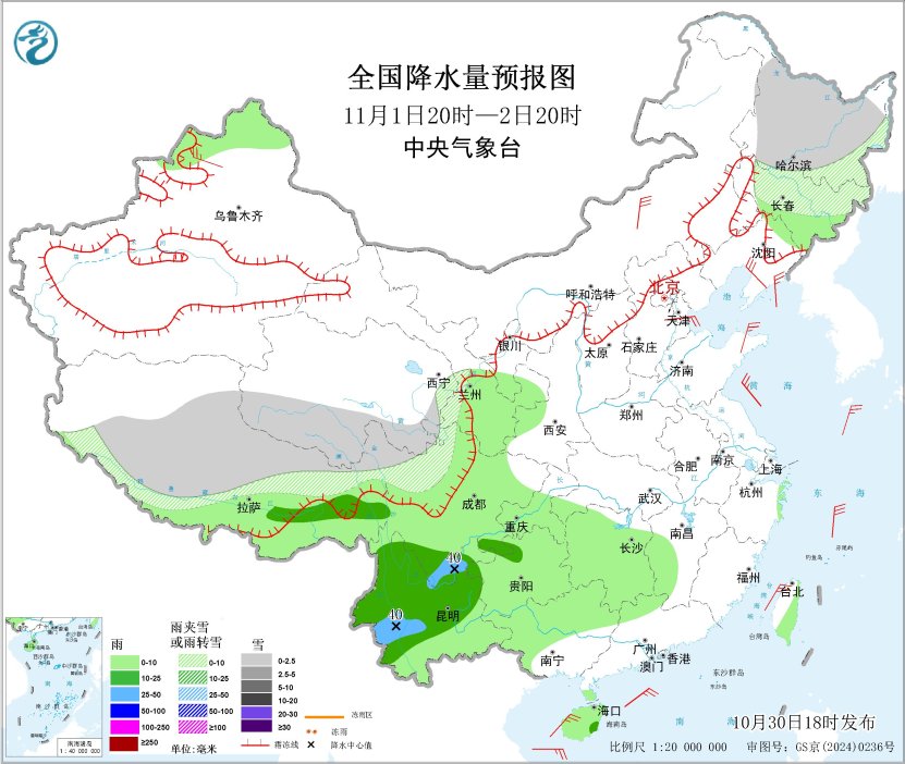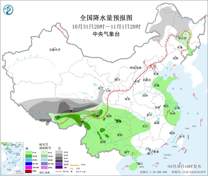 今天白天,青藏高原東部出現雨雪天氣。10月30日至11月2日,青藏高原東部有持續雨雪天氣,部分地區有大到暴雪,局地有大暴雪或特大暴雪,關注對交通運輸、設施農業等的影響。華北中南部、黃淮及蘇皖北部、四川盆地等地部分地區有霧或霾天氣,關注對人體健康、交通運輸等的影響。