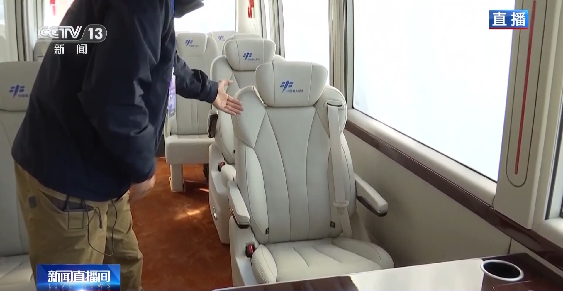 來到車內首先感受到的是內部空間更加寬敞,新車型的第一個特點就是縮減了座椅的數量,採用15座設計。其中有4個座位很特別,這是航天員的專用航空座椅。和普通座椅相比,專用座椅進行了加寬,它的寬度達到60釐米,可以進行6向電動調節。可以想象,當航天員穿着厚重的航天服坐在這裏的時候,應該會比較舒適。