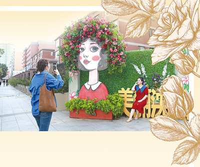 瀋陽市民在位於青年大街上的玫瑰少女景觀小品前拍照。