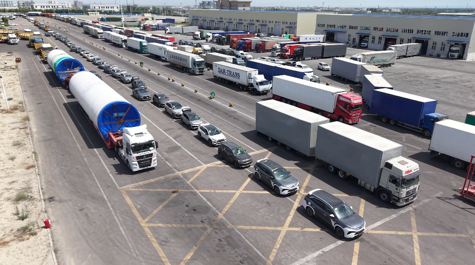 10月20日,在霍爾果斯公路口岸等待出境的商品車和運輸車輛。(無人機航拍)(受訪者供圖)