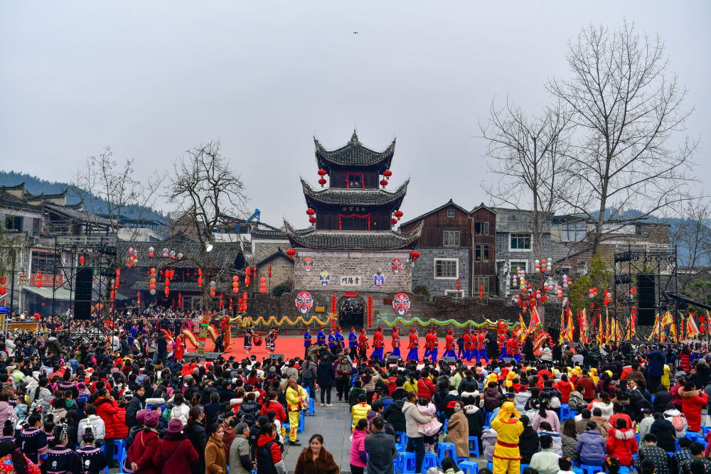 這是2月11日拍攝的貴州錦屏隆裏“村晚遇元宵·來隆裏玩花臉龍”活動現場。新華社記者 楊文斌 攝