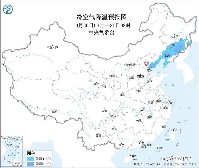 值得關注的是,11月7日前後,將有一股較強冷空氣自西向東影響我國大部地區,長江以北大部地區氣温下降4~8℃,局地降温10℃以上;並伴有大風天氣。