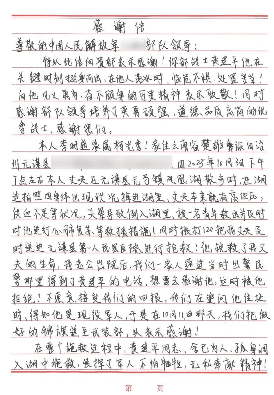 休假軍士跳湖救人!20多天後立功喜報送上家門