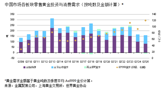 作為全球黃金市場的重要一極,中國市場的表現呈現出鮮明的結構性特徵。三季度,中國零售黃金投資與消費需求(包括金飾、金條、金幣及黃金ETF)總量為152噸,同比下降7%,為2009年以來最疲弱的三季度表現。