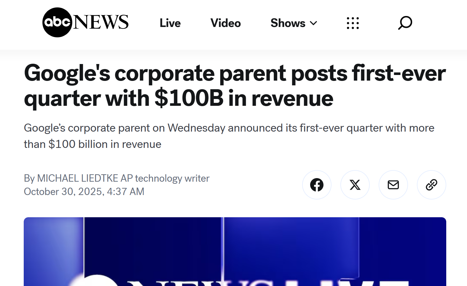 【環球網科技綜合報道】10月30日消息,據ABC News報道,谷歌母公司Alphabet近日發佈2025財年第三季度財報,財報數據顯示,截至9月30日,該公司當季營收首次突破1000億美元大關,核心廣告業務與雲計算部門均呈現穩健增長態勢,多項關鍵財務指標超出華爾街預期。