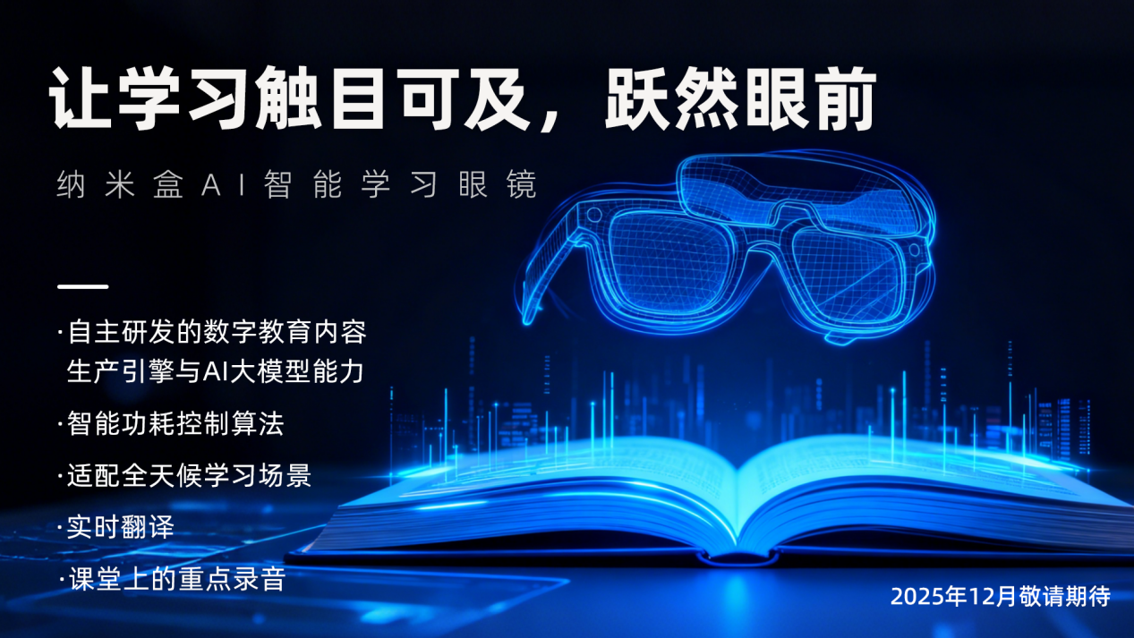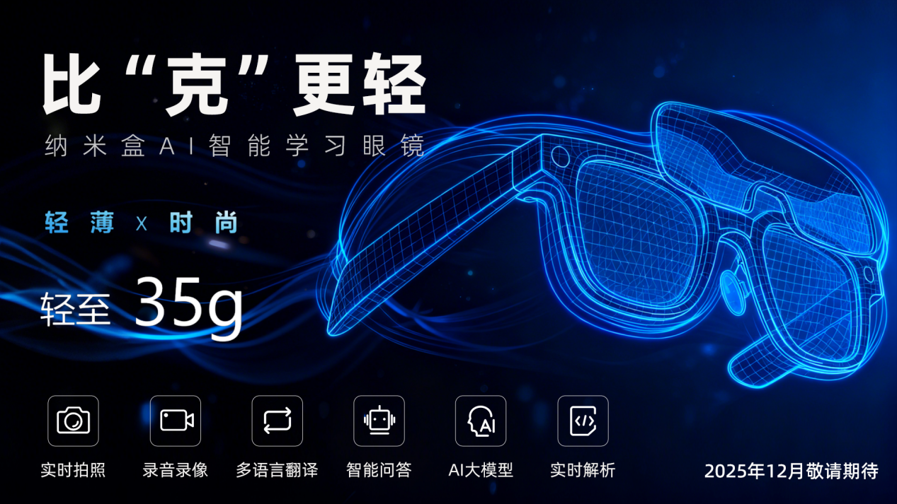 僅35g,雙目全綵:納米盒AI智能學習眼鏡輕盈來襲,12月敬請期待!
