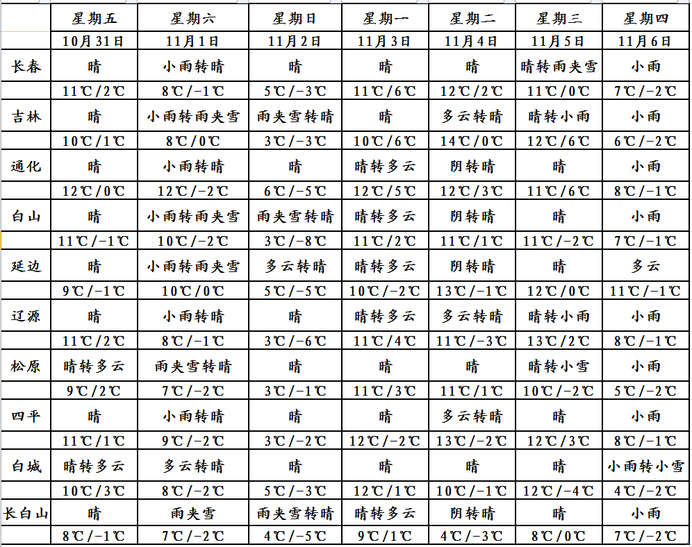 **長春市氣象台10月31日早晨發佈天氣預報: