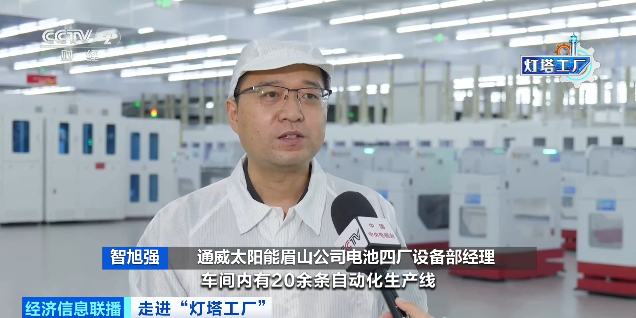 通威太陽能眉山公司電池四廠設備部經理 智旭強:車間內有20餘條自動化生產線,在數字化轉型後,日產量從2024年的441萬片,提升至目前的495萬片,淨增54萬片每天。