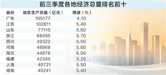 從經濟總量看,廣東前三季度GDP達到10.52萬億元,江蘇為10.28萬億元,兩省首次在三季度便站上10萬億元台階。山東和浙江分別以7.71萬億元和6.85萬億元的體量、5.6%和5.7%的同比增速,展現出強勁的發展勢頭。