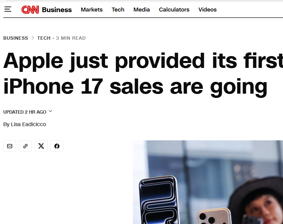 【環球網科技綜合報道】10月31日,據外媒CNN報道,蘋果公司於日前公佈了第四財季業績,總營收與iPhone銷售額均創下歷史同期新高,初步顯示了新一代iPhone 17系列的市場吸引力。儘管大中華區營收同比下滑,且面臨關税與AI競賽的壓力,首席執行官蒂姆·庫克對即將到來的假日季仍表達了前所未有的樂觀預期,推動公司盤後股價上漲約3%。