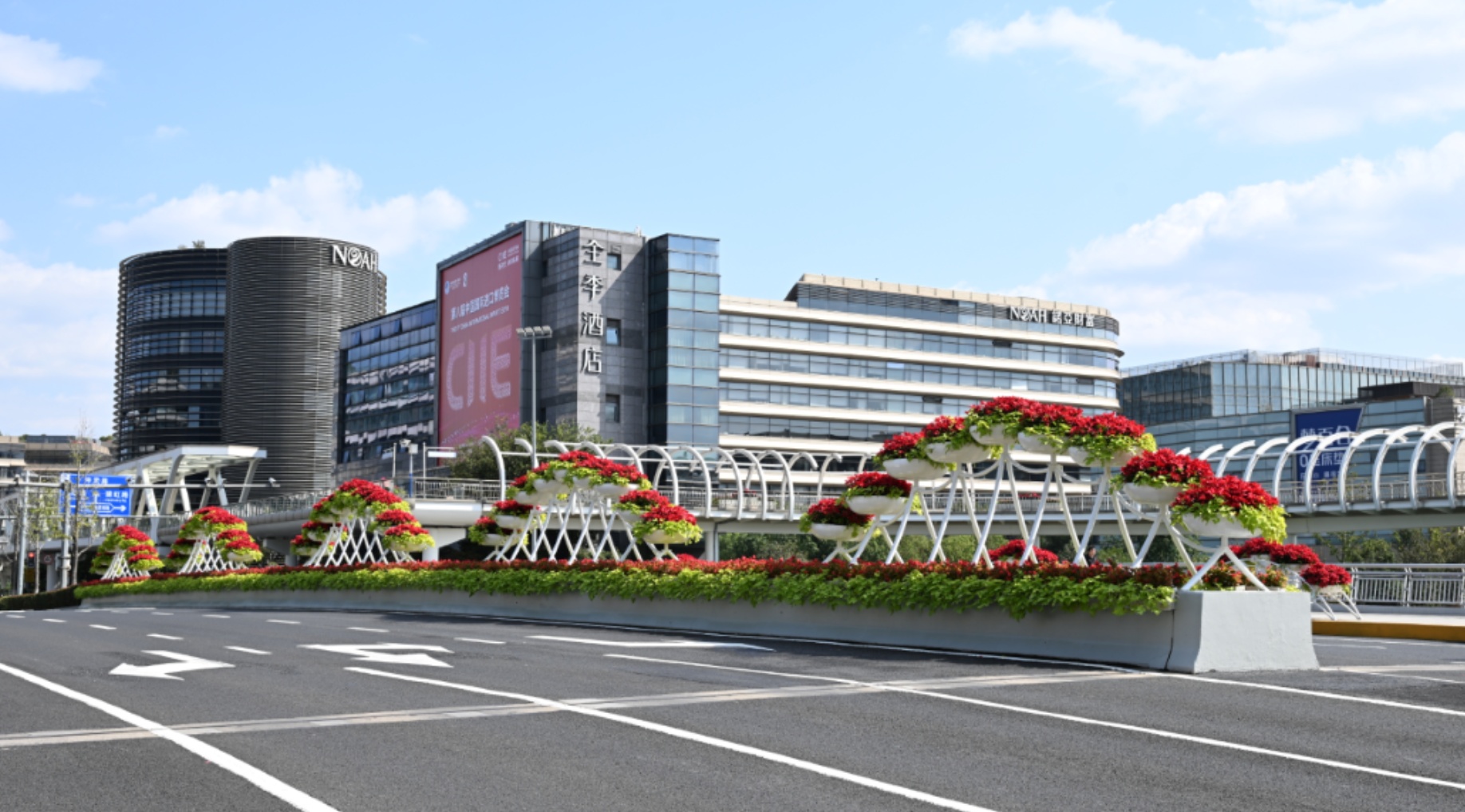 連通虹橋國際中央商務區與進博會主場館的二層步廊,是參展賓客的重要通道之一,精心佈置的花箱、草花,烘托出熱情洋溢的迎賓氛圍。位於嘉閔高架建虹路下匝口的“一帶一路”“大進寶”用一抹嫣紅迎接進博客商;虹許路虹橋路口的“花珠匯海”以及不遠處的“虹橋之眼”喜迎各方嘉賓;處在小陸家嘴環島中心的“開放之門”向世界訴説着改革開放的上海故事。“申字形”高架打造的“空中花廊”生機盎然,三角梅、亮金女貞、六道木等花卉通過科學養護與花期調控,確保進博會期間保持最佳觀賞狀態。上海全市170條主要道路乾淨整潔,60個景觀區域美觀宜人,黃浦江、蘇州河清波盪漾,全方位展現上海的城市環境品質。