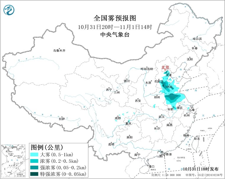 預計,10月31日夜間至11月1日上午,北京東南部、天津中西部、河北中南部、山東中西部、河南東部、安徽中北部、江蘇北部等地的部分地區有大霧,其中,天津西部、河北東南部、山東西部、河南東部、安徽北部、江蘇北部等地的部分地區有能見度低於500米的濃霧,局地有能見度低於200米的強濃霧。