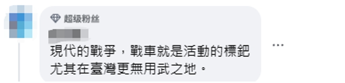 還有人説,“實在浪費錢,從機動速度慢,到台灣可作戰區域少,可見實在浪費錢”“現代的戰爭,坦克就是活動的標靶,尤其在台灣更無用武之地”。