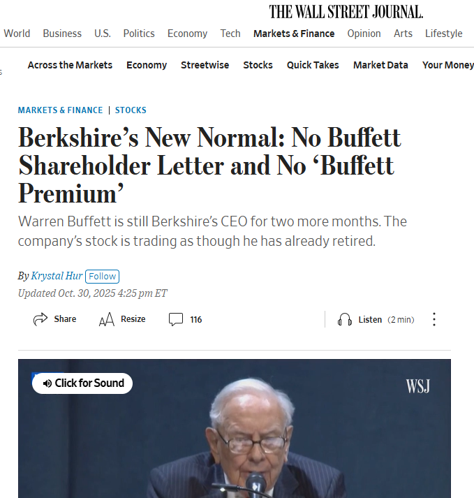【環球網財經綜合報道】據《華爾街日報》消息,隨着95歲的傳奇掌門人沃倫·巴菲特(Warren Buffett)即將在年底卸任首席執行官,伯克希爾哈撒韋公司正步入一個深刻的轉型期。這家由“奧馬哈先知”一手構建的投資版圖,不僅在股價上感受到了他即將缺席的寒意,更在企業文化與投資者關係上,面臨着告別“巴菲特溢價”、重塑市場信心的嚴峻考驗。
