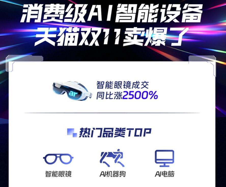 消費級AI智能硬件正在雙11迎來爆發式增長。10月31日,記者獲悉,今年天貓雙11,AI智能硬件設備熱銷。開賣至今,智能眼鏡品類成交量同比暴漲25倍,品牌成交方面,Rokid同比成交增長超7倍,雷鳥智能眼鏡同比增長超80%,機器人品牌weilan、雲深處、優必選、enabot等均雙位數以上增長。目前智能眼鏡、智能機器人、AI電腦等躍居天貓3C數碼行業趨勢熱門品類TOP3。