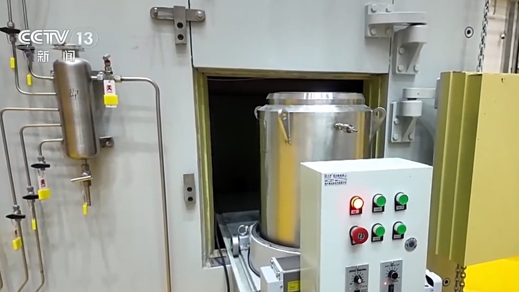 *總枱央視記者 帥俊全:*釷基熔鹽堆的核燃料究竟長什麼樣?現在我手裏拿的就是它的燃料鹽,常温下可以看到是綠色的鹽塊。它其實是由白色的氟化釷加上綠色的氟化鈾和基鹽混合而成。聽起來感覺很簡單,但其實它是我們的科研團隊在十年的時間經過上千次的調配才把工藝參數最終確定下來,使燃料鹽能夠在西部戈壁上真正去點燃釷基熔鹽堆。