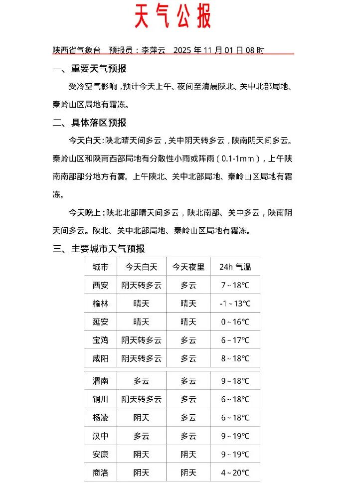 受冷空氣影響,預計今天上午、夜間至清晨,陝北、關中北部局地、秦嶺山區局地有霜凍。