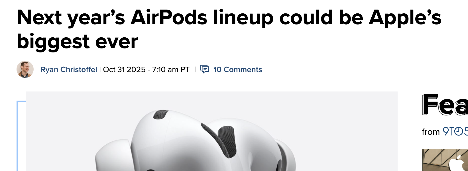 【環球網科技綜合報道】11月1日消息,科技媒體9to5Mac最新報道稱,蘋果公司計劃在2026年擴充其AirPods產品線,在現有標準版和Pro版基礎上,新增一款搭載內置攝像頭的“AI版”AirPods。