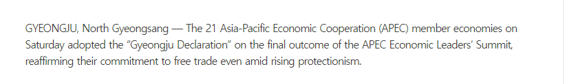 韓國《中央日報》報道稱,《慶州宣言》反映出此次APEC領導人峯會的最終成果,並重申了在保護主義抬頭的背景下,各成員領導人對自由貿易的承諾。