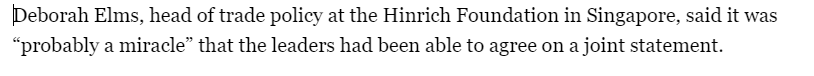 半島電視台也關注了此次峯會,報道援引新加坡欣裏奇基金會貿易政策負責人黛博拉•埃爾姆斯的話説,各成員領導人能夠就聯合聲明達成一致是“了不起的事情”。他説,鑑於亞太經合組織經濟體的不同立場,要將任何達成一致的措辭寫入文件都是一項“充滿挑戰的工作”。