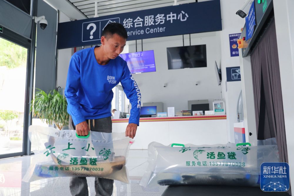 ↑ 10月31日,工作人員將裝袋、加氧後的小灣東鎮生態江魚放上安檢設備,準備通過高鐵動車運往昆明。