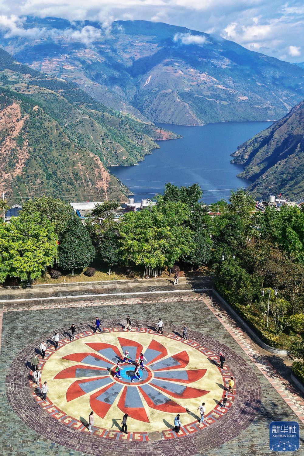 ↑ 10月31日,小灣東鎮居民在瀾滄江畔的移民廣場休閒(無人機照片)。