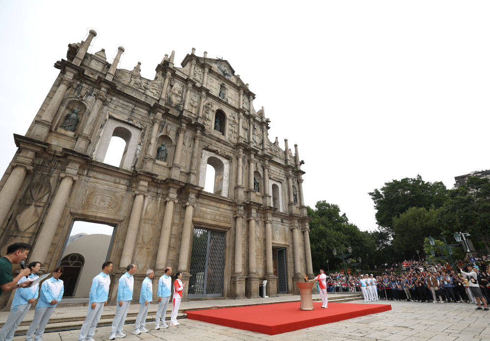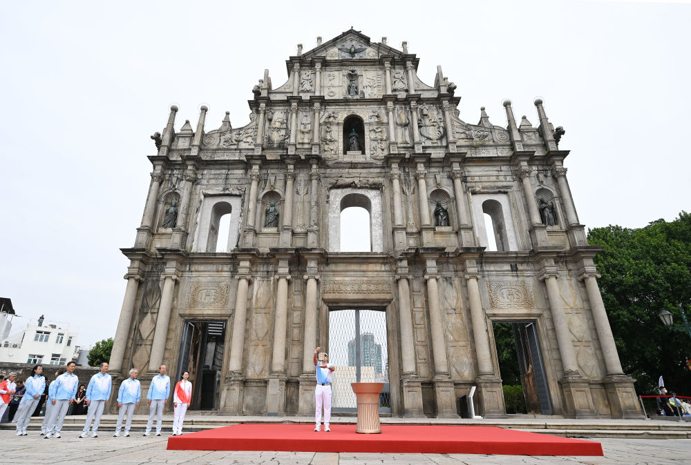 ↑ 火炬手和嘉賓在大三巴牌坊前合影。新華社發(張金加攝)