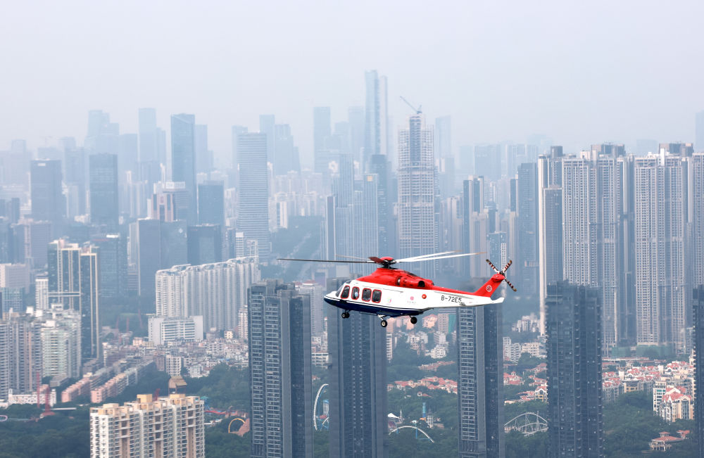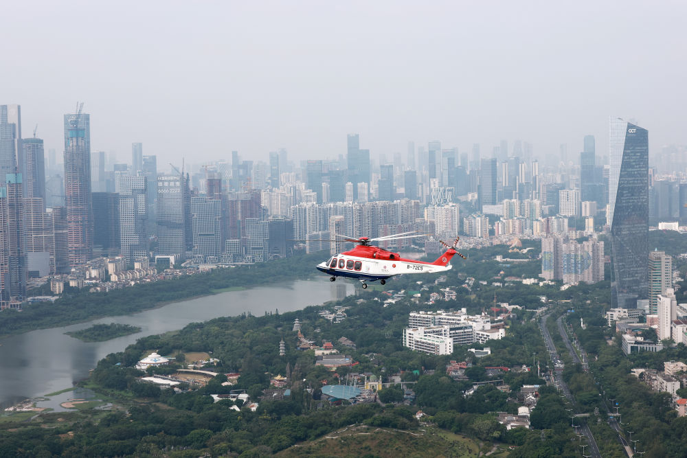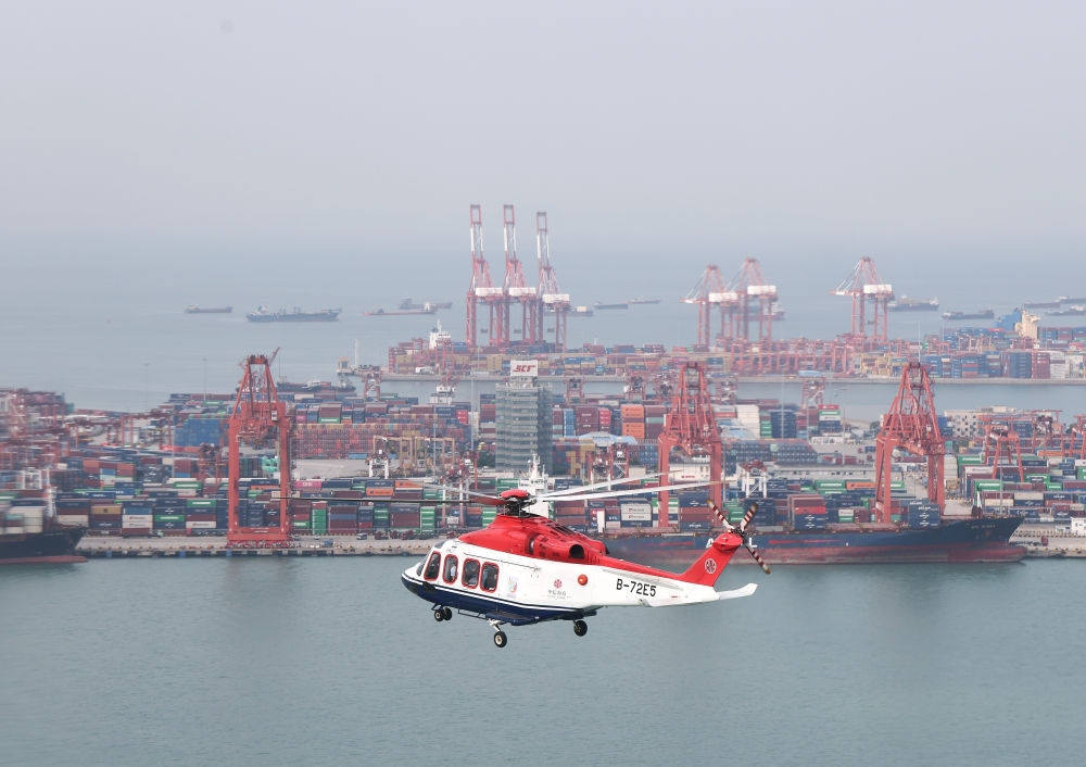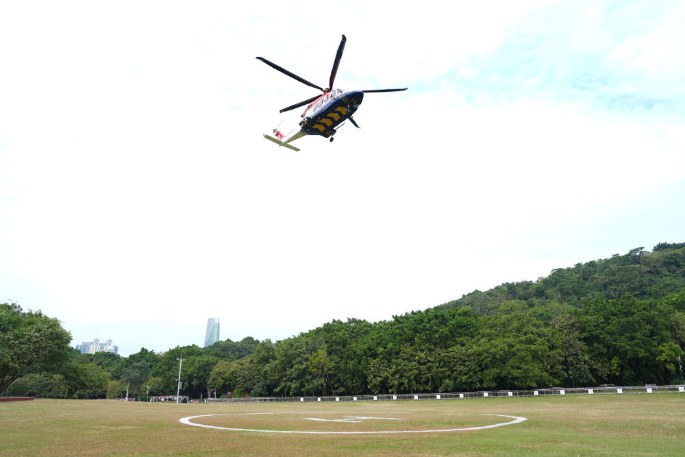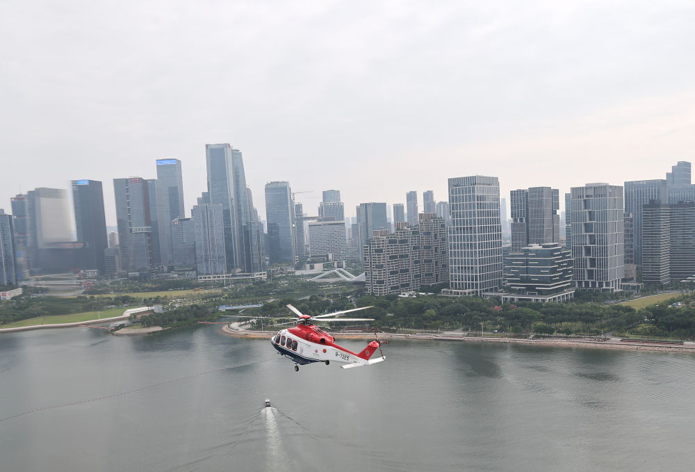 ↑ 搭載聖火的直升機進行空中傳遞。新華社記者 梁旭 攝