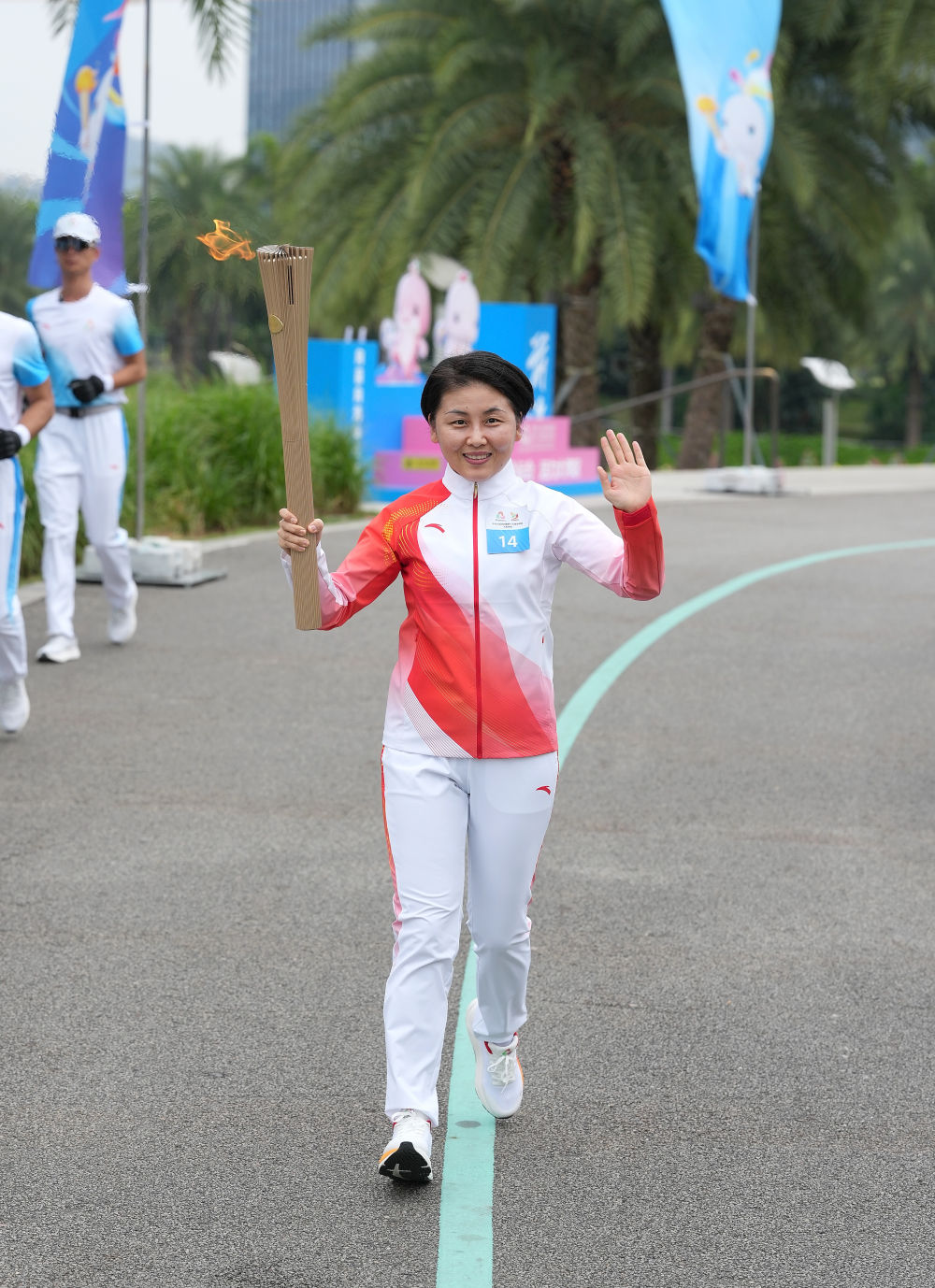 ↑ 火炬手何超瓊在火炬傳遞活動中。新華社記者 那宇奇 攝