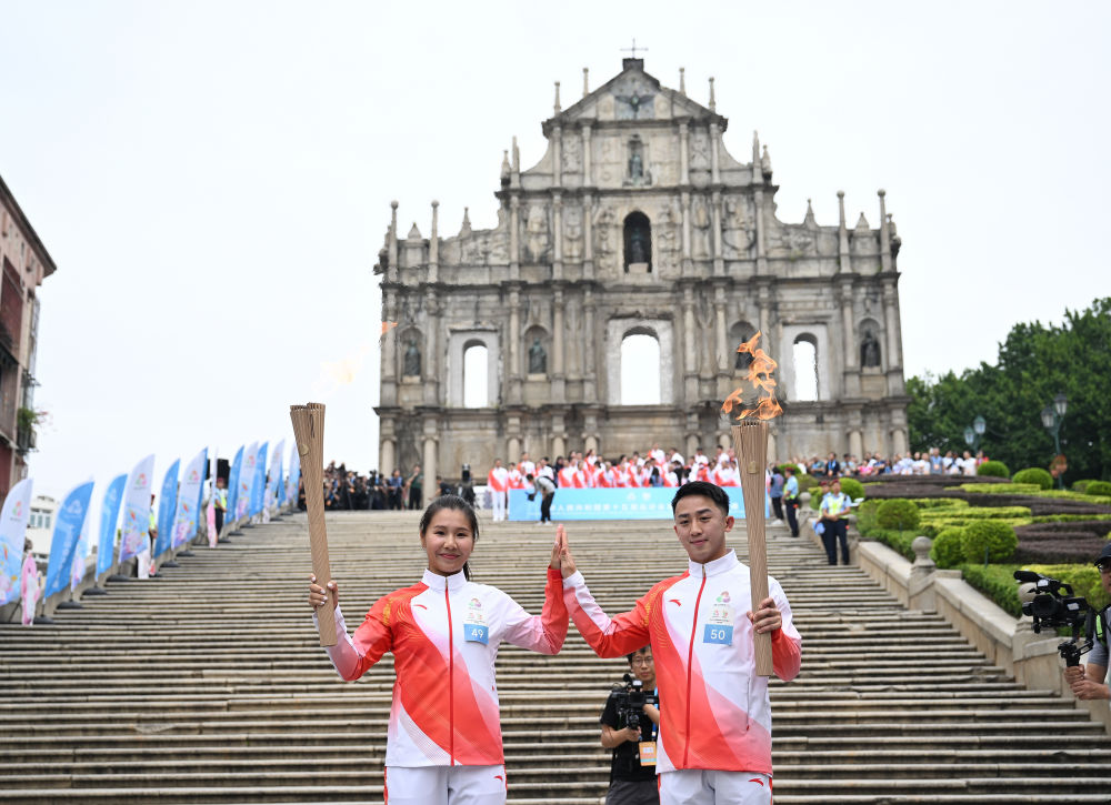 ↑ 火炬手郭建恆(右)、區海欣在大三巴牌坊前傳遞火炬。新華社發(張金加攝)
