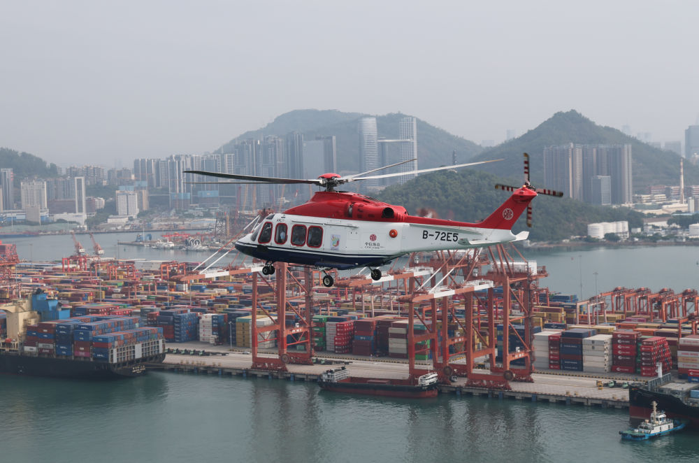 ↑ 搭載聖火的直升機進行空中傳遞。新華社記者 江漢 攝
