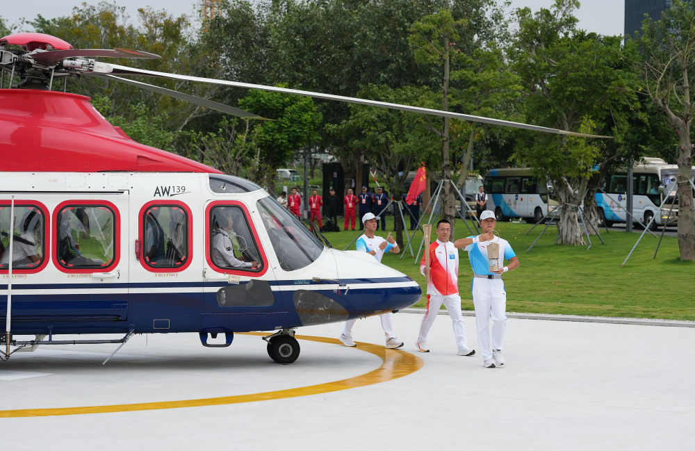 ↑ 火炬手蘭小軍(左二)手持火炬向直升機走去,他將進行空中傳遞。新華社記者 江漢 攝