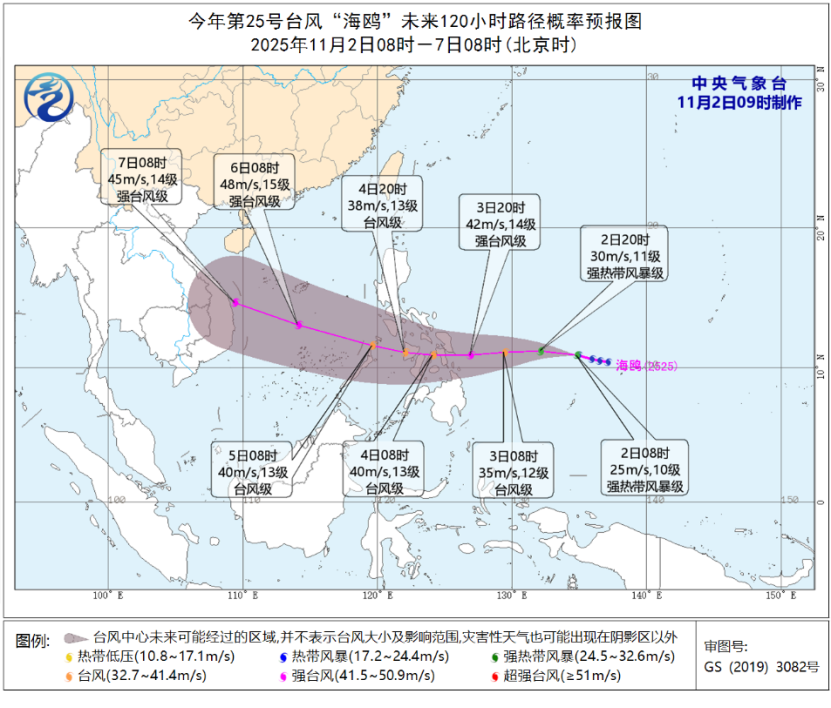 *今年第25號颱風生成。*今年第25號颱風“海鷗”已於11月1日晚上生成,今晨8點位於菲律賓馬尼拉東偏南方向約1550公里的洋麪上;預計“海鷗”將以每小時20公里左右的速度向西偏北方向移動,4日穿過菲律賓中部,5日移入南海東部海面上,未來逐漸趨向越南中南部沿海,強度逐漸加強,最強可達颱風級或強颱風級(40~48米/秒,13~15級)。