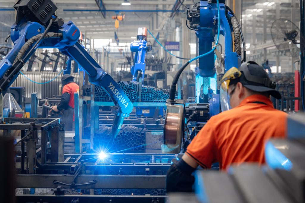 10月16日,在江蘇省徐州市豐縣電動車生產企業車間內,工人在焊接電動三輪車配件。新華社記者 毛俊 攝
