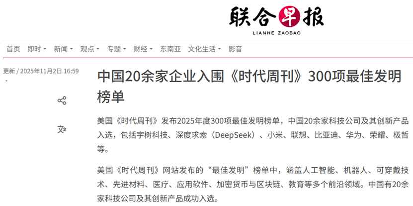 值得關注的是,在今年公佈的榜單中,中國企業表現亮眼,20餘家科技公司及其創新產品成功入選,包括宇樹科技、DeepSeek、小米、聯想、比亞迪、華為、榮耀、極哲等。