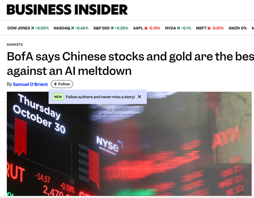 英國《商業內幕》近日發文稱,摩根大通分析師邁克爾·哈特內特建議,將黃金和中國股市作為對AI泡沫風險的對策,指出中國股市估值較低且有增長潛力。