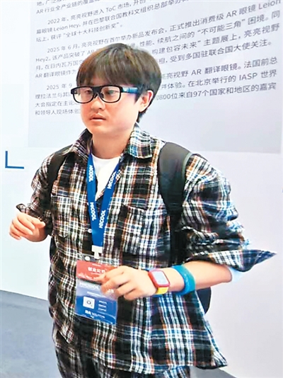 在亮亮視野展區,記者沉浸式體驗了企業最新推出的第二代AR翻譯眼鏡——Leion Hey2。佩戴這款眼鏡後,只需自然目視前方,視線約2至3米處便會浮現清晰懸浮字幕,無需低頭查看其他設備,就能實現“抬頭交流、沉浸溝通”的無打斷跨語言交流體驗。