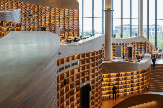在天府人文藝術圖書館,最令人印象深刻是大廳。以四川竹文化為主調打造的書架設施,高低有致地排開,如連綿山巒,透着清新雅緻,設計取義於“書山有路勤為徑”。蜿蜒的樓梯穿插其中,透過“書山”邊的玻璃幕牆能飽覽湖光,坐在休閒軟椅上,讀者們舒然開卷。