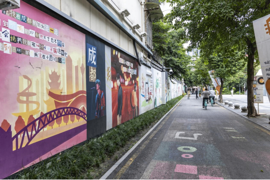 隨着成馬選手奔跑的背影逐漸遠去,記者一行人來到天府藝術公園文博坊。文博坊由天府美術館、當代藝術館、天府人文藝術圖書館、天府111商業水街、迎桂湖等組成,是成都“八街九坊十景”中“十景”之一的地標公園。