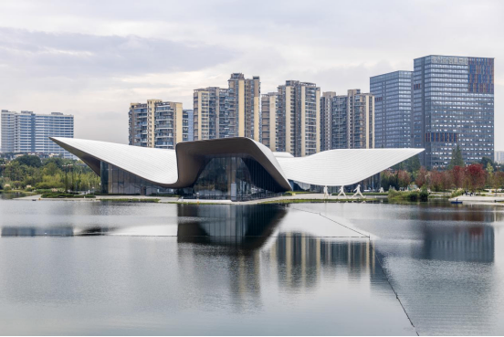 走進公園,成都市美術館如出水芙蓉盛開在湖畔,毗鄰的成都市當代藝術館和天府人文藝術圖書館形似層巒疊嶂的羣山,復現“窗含西嶺千秋雪”之景。出新出彩的藝術展覽,深度與趣味並重的公共教育活動,舒適貼心的閲讀環境,讓天府藝術公園充滿“文藝範兒”。