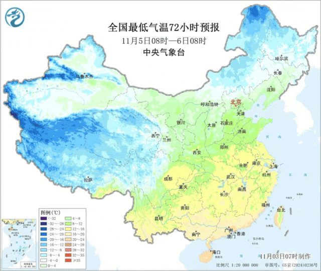 11月5日至9日,將有較強冷空氣自西向東影響我國大部地區。其中5至7日,新疆大部、青藏高原西部、內蒙古西部有6℃至8℃降温,並伴有4至6級風,新疆沿天山地區降温10℃至16℃,山口地區風力8至9級、陣風10至11級;新疆北部有小到中雪或雨夾雪,高海拔地區有大到暴雪、局地大暴雪,新增積雪深度8至12釐米,局地15至22釐米。
