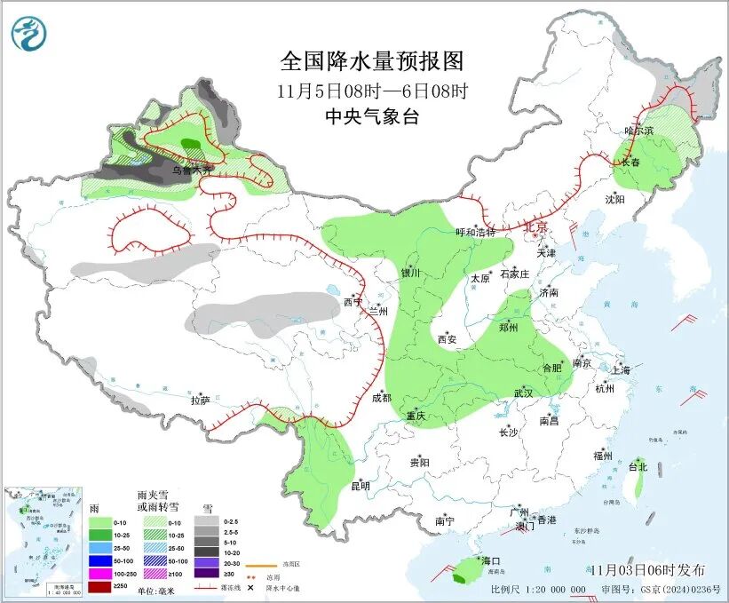 *11月5日8時至6日8時,*新疆北部、東北地區東部、青海中部等地部分地區有小到中雪或雨夾雪。其中,新疆阿勒泰、沿天山一帶等地部分地區有大到暴雪(10至15毫米),新增積雪深度6至10釐米,部分地區15至20釐米。內蒙古西部、西北地區東部、黃淮西部、江淮西部、江漢、西南地區東北部和西南部、海南島等地部分地區有小雨,局地有中雨。南海東南部海域將有10至12級、陣風13級的風,南海西南部海域將有10至11級、陣風12級的風,南海中部海域將有6至8級、陣風9級的風。