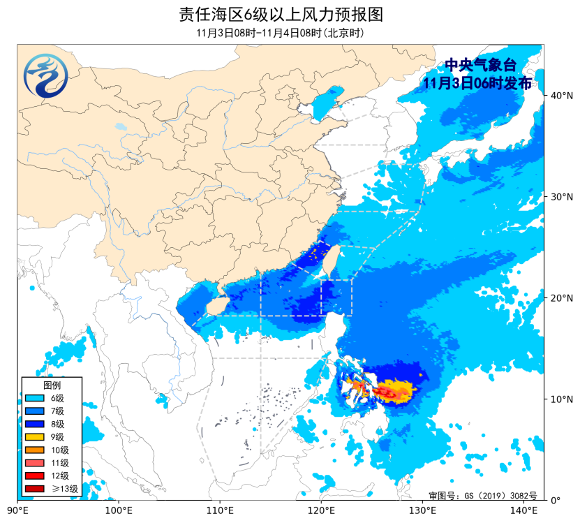 受冷空氣影響,11月3日至5日,黃海、東海海域將有6至7級、陣風8級的偏北風,台灣海峽、巴士海峽將有6至8級、陣風9至10級的東北風,南海海域將有10至11級、陣風12至13級的東北風。
