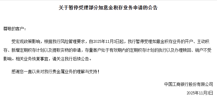 【環球網財經綜合報道】中國工商銀行於11月3日發佈公告,宣佈受宏觀政策影響,根據相關風險管理要求,自即日起暫停受理“如意金積存”業務的新開户、主動積存、新增定期積存計劃及提取實物申請。存量客户的已有定投計劃執行、贖回及銷户等業務不受影響。