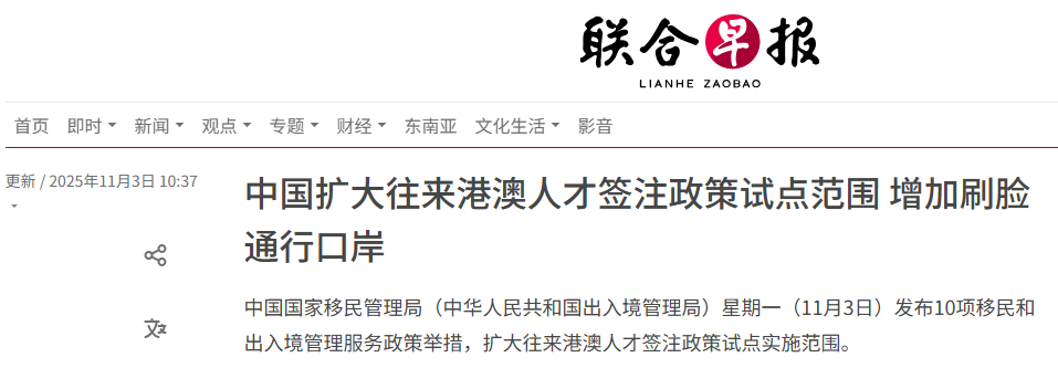 新政策還特別關注重點區域的人才流動。自11月5日起,在河套深港科技創新合作區深圳園區工作的符合條件的大陸人才,公安機關出入境管理機構可為其簽發3年多次有效的往來香港、澳門人才簽註,以促進該區域的科技創新與合作。(文馨)
