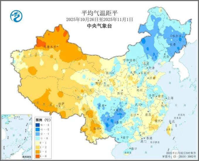 上週(10月26日至11月1日),內蒙古東部、東北地區中東部、西南地區東部等地平均氣温較常年同期偏低1℃至4℃,新疆大部、甘肅西部、福建西部、雲南中西部等地偏高1℃至4℃,其餘大部地區氣温接近常年。
